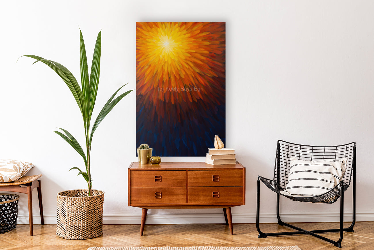 Giclée Stretched Canvas Print: Giclée print on museum quality 410gsm polycotton canvas. Stretched on 1.5-inch pine wood with back wire installed for hanging.