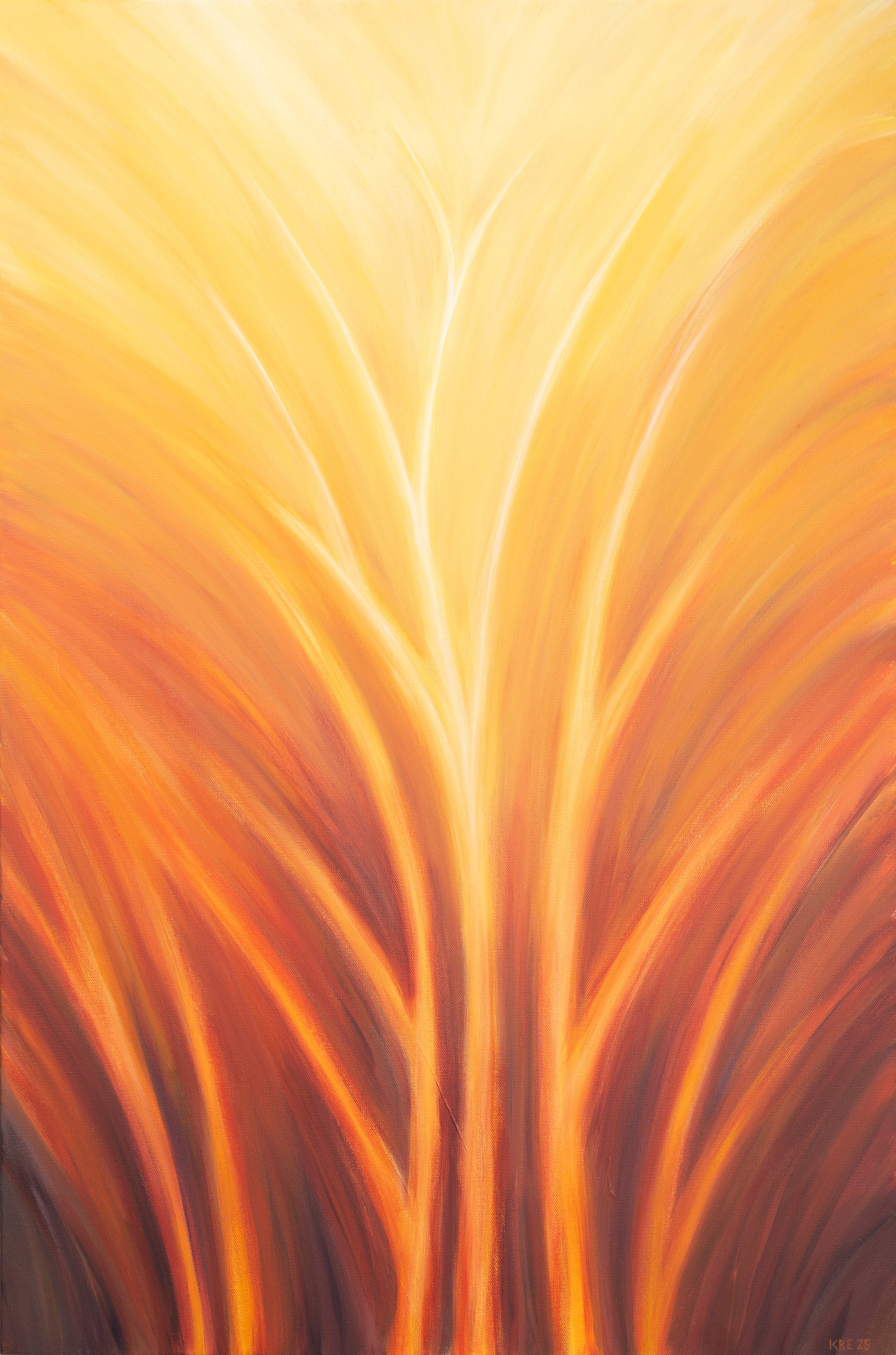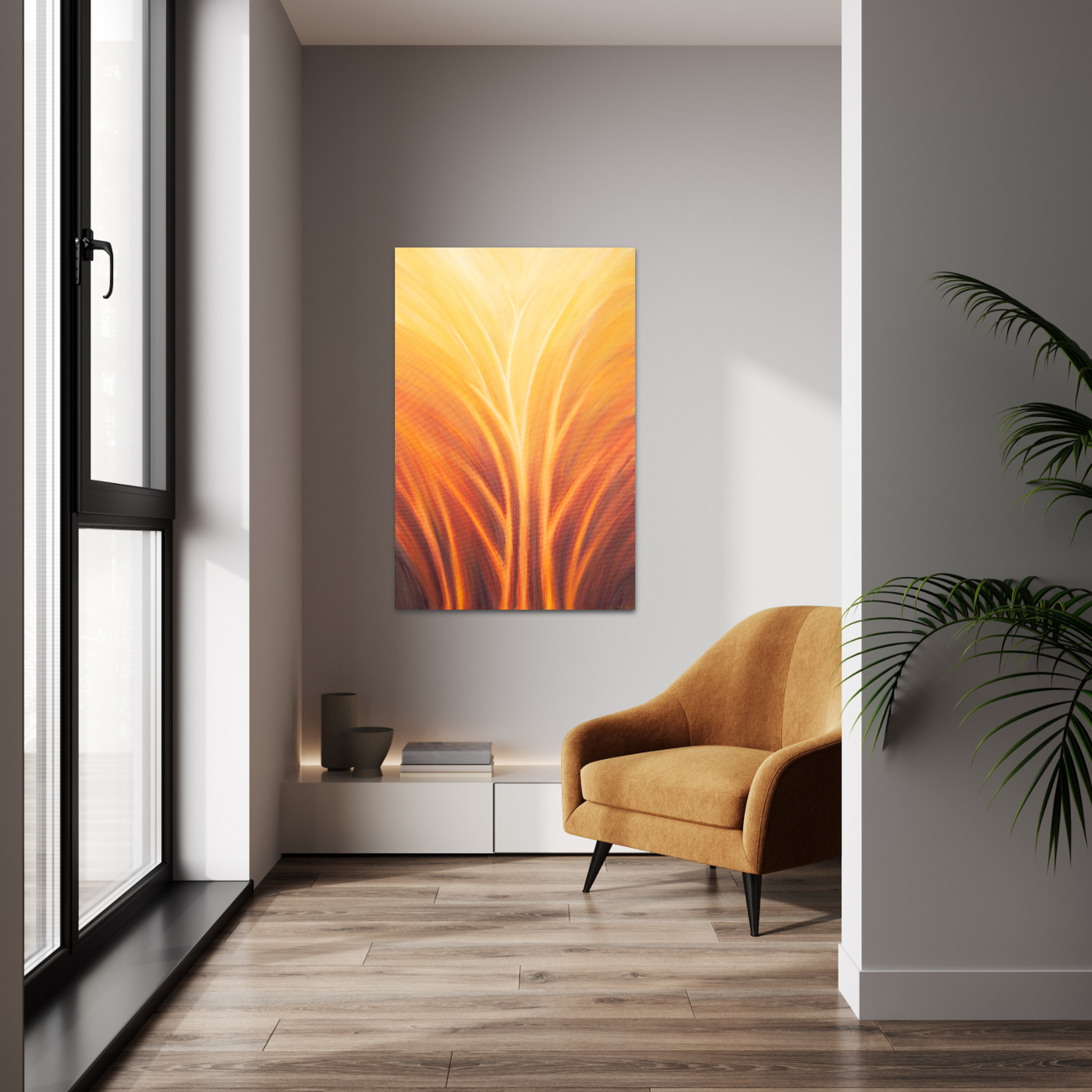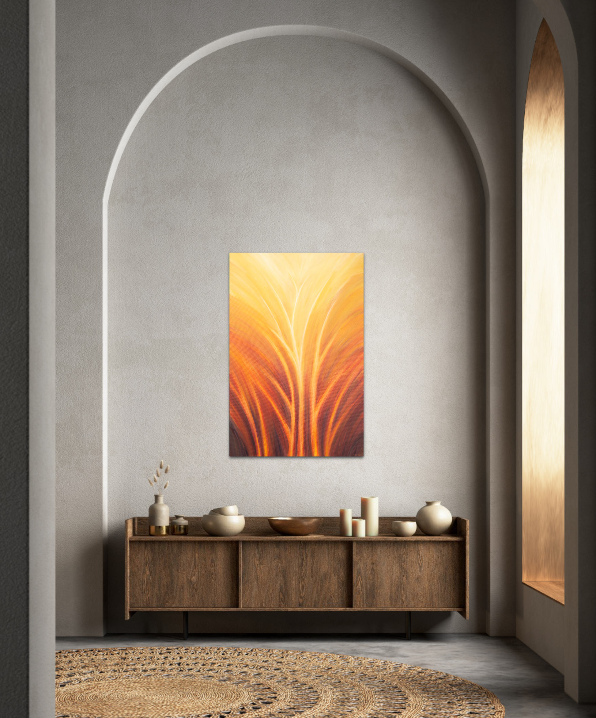Warmth, comfort, reaching, growing, illuminating. Warming, grounding tones of yellow, gold, burnt orange, and warm brown. A painting to inspire a sense of comfort, peace, and relaxation, supporting inner healing and growth.
